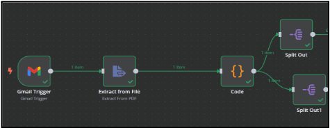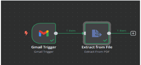 The "Gmail Trigger" node successfully fetched an email with an attached PDF file.