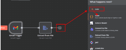 4.1. Click ‘+’ symbol, In the search box, type 'Code' and select the ‘code node’.