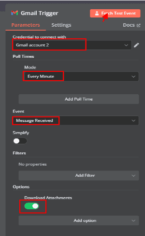 Download Attachments: Enabled ✅ (This ensures that any attachments in the email are fetched for further processing).