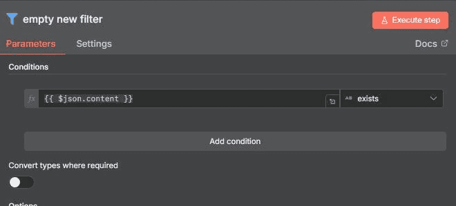 This filter node checks whether leftValue = {{ $json.content }} exists. Its purpose is to remove items that have no article body or contain empty content, ensuring that only entries with real, usable text are passed forward. As a result, the summarizer processes only valid content, and the output consists exclusively of items that include a proper article body.