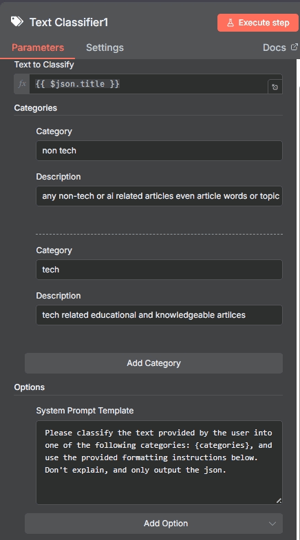 This node uses the mistral-small-latest model to classify content based on technical relevance. The input is provided as inputText = { $json.title }allowing the model to analyze each item’s title. Two categories are defined: non tech, which includes non-technical, entertainment, or pop culture content, and tech, which covers educational and knowledge-based technical topics. The purpose of this node is to automatically classify each item as either tech or non tech. Only items classified as tech are routed to the next node via output channel 2, ensuring that the final output contains strictly technical content suitable for further processing.