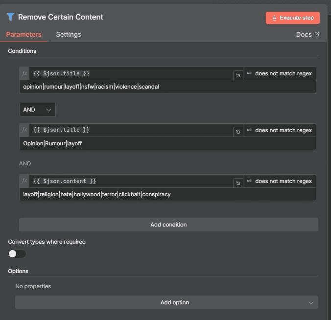 This filter node applies multiple conditions using logical AND to block sensitive, unsafe, or irrelevant topics from entering the research pipeline. The first condition ensures the Title does not match keywords such as . This filter node applies multiple conditions using logical AND to block sensitive, unsafe, or irrelevant topics from entering the research pipeline. It performs title-level and content-level checks to exclude opinion-driven, controversial, or low-signal material. This ensures that only high-quality, relevant research content passes through, keeping the pipeline focused on actionable and reliable information. This filtering step prevents opinion-heavy, controversial, or low-signal content from passing through, ensuring the output remains focused on high-quality, relevant research material.