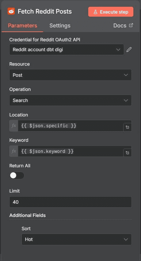 Add a new node and search for “Reddit”, then configure it by setting the Resource to Post, the Operation to Search, and selecting your Reddit OAuth2 credential. Next, fill in the parameters by choosing the Location (subreddit) as artificial (or any relevant subreddit), setting the Keyword to agents (or any target term), the Limit to 40, and the Sort option to Hot to retrieve currently trending discussions.tt