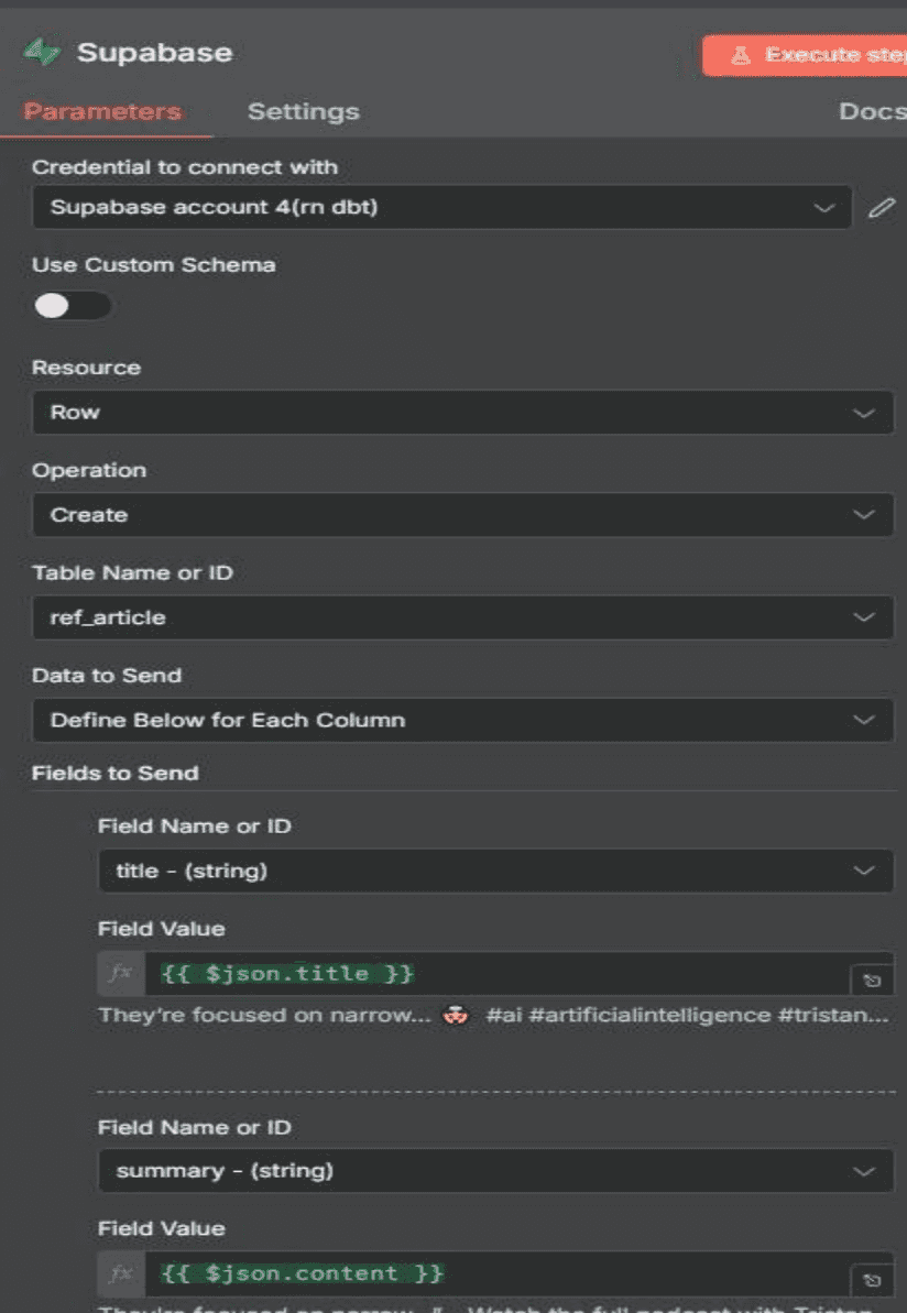 5.1. Supabase Node This node inserts the finalized AI-generated research snippets into the Supabase database for long-term storage