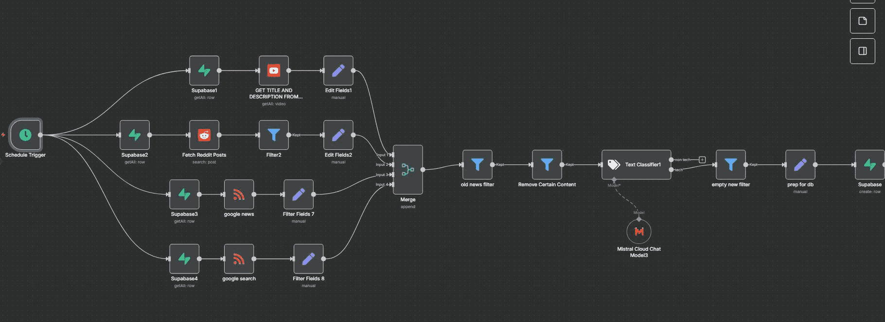 This workflow fully automates the collection and cleaning of articles from RSS, Reddit, and YouTube. It merges all sources, removes unsafe or irrelevant topics, filters old content, and keeps only fresh, high quality tech items with real text. The result is a reliable, ready to use research feed that powers your AI summarizer and content engine with consistent, accurate, and relevant information than saves final output in supabase.