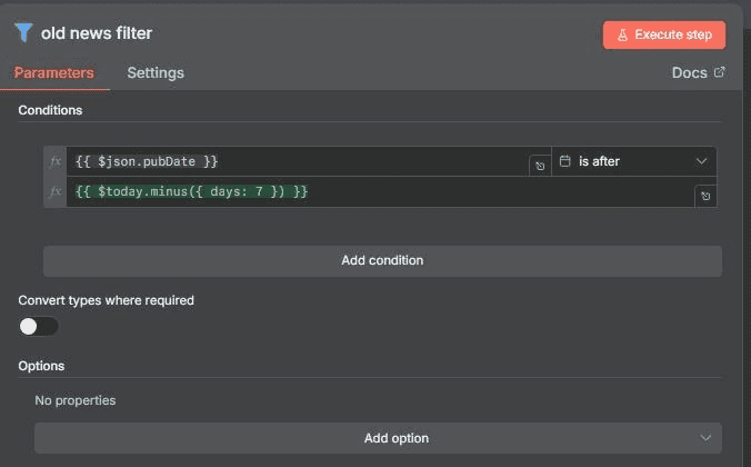 4.2.4. The right value is set to {{ $today.minus({ days: 7 }) }} to keep only items from the last 7 days.