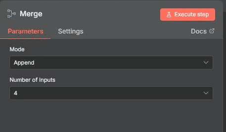 4.1.1. This node uses the n8n Merge node to combine multiple inputs.